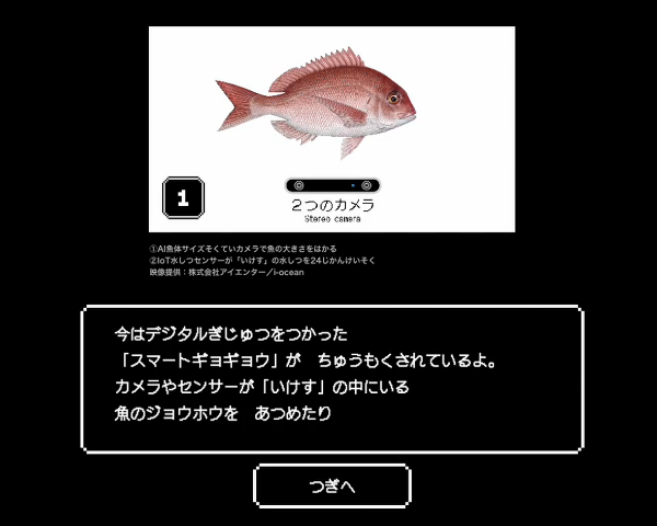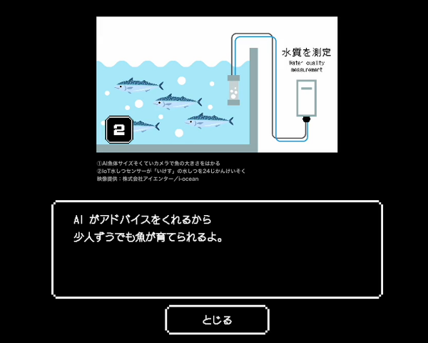 本ゲームは、プレイヤーが「養殖」「機械」「研究」3つの国のいずれかの勇者となり、水産業が直面する課題をクイズ形式で解決していくロールプレイング風の世界観をもつゲームです。ゲーム内では、気候変動による海洋環境の変化や、漁業従事者の高齢化など、現代の水産業が抱える課題を取り上げています。プレイヤーが、陸上養殖、自動給餌機、水空合体ドローンなどの技術や研究を通じてそれらの課題を解決し、未来にまで美味しいおすしを食べ続けられるために、さまざまな技術が必要であることを理解できるようなストーリーになっています。